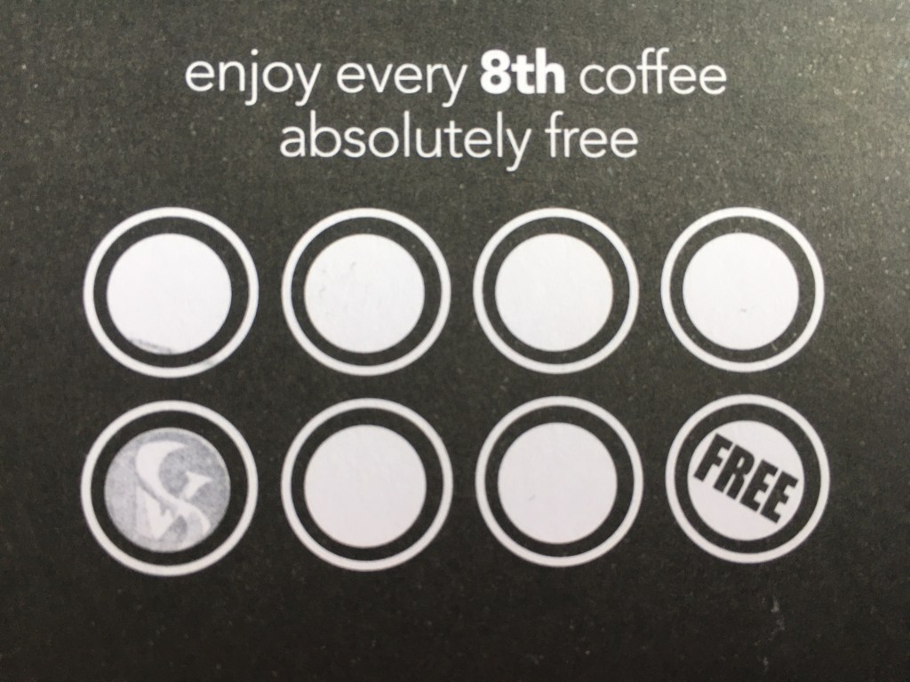 Anyway, the Random Act of Kindness happened when I went to the coffee shop for a relaxing cup of caffeine. I was standing in the queue when a woman approached me, smiling and wordlessly handed over a loyalty card with 6 stamps on it. I said thank you and she walked away. When my brain actually started to kick in I looked again to the woman and asked “Are you sure? That’s very kind”. She just smiled and nodded. At the time I was taken aback, it made me smile but I never gave it much thought. I got my coffee and headed off to deal with my list of tasks.